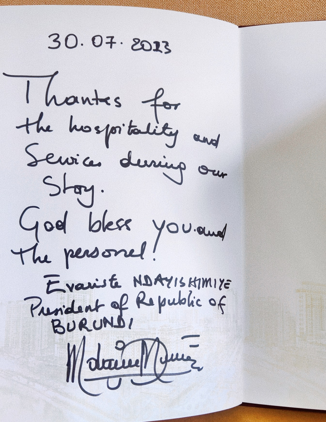 國家領(lǐng)導(dǎo)人及夫人離館之際,在金牛賓館親切問候了賓館以黨科同志為代表的服務(wù)保障團(tuán)隊(duì)成員,表達(dá)了對川菜的喜愛,夸贊川菜“巴適”,并表示在金牛賓館可以享用到正宗的川菜,稱贊金牛賓館是有傳統(tǒng)的賓館。布隆迪總統(tǒng)恩達(dá)伊施米耶在錦江賓館留言簿上留言,表示了對錦江賓館此次接待的感謝,并與接待人員合影留念。