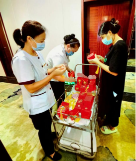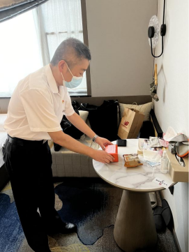 四川省公安干警接待站入住的大部分客人都是公安干警,為了成都的疫情防控工作,他們舍小家為大家,堅守在自己的崗位上。酒店留守的15名員工亦是如此,值守在防疫一線的同時,仍保證了接待服務品質(zhì)。中秋佳節(jié)之際,酒店為每一位因疫情不能與家人團聚的客人及留守員工送上了美味的月餅和中秋祝福,感謝他們與酒店一起同心防疫的態(tài)度與決心,傳遞酒店的文化與溫暖。