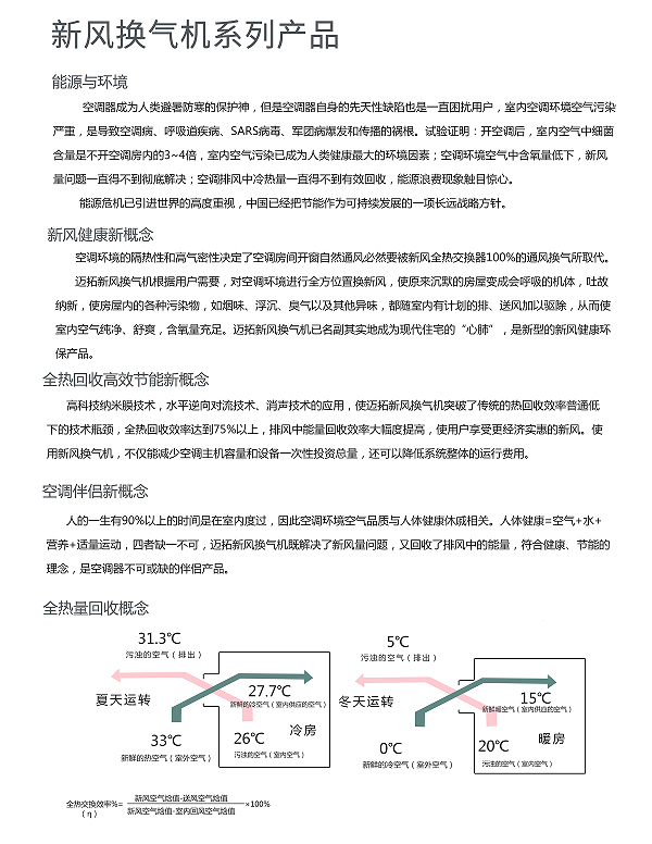 新風(fēng)換氣機又名吊頂是根據(jù)在密閉的室內(nèi)一側(cè)送風(fēng)另一側(cè)引風(fēng),則在室內(nèi)會形成“新風(fēng)流動場”的原理進(jìn)行設(shè)計研制的。它依靠機械送風(fēng)、引風(fēng),強迫在系統(tǒng)內(nèi)形成新風(fēng)流動場。是一種時刻保持室內(nèi)空氣潔凈清新的新型環(huán)保電器。這種獨立的室內(nèi)空氣置換、凈化循環(huán)系統(tǒng),能在排除室內(nèi)的污染空氣的同時,輸入自然新鮮空氣,將輸入室內(nèi)的新風(fēng)先經(jīng)過濾、殺菌、加熱、增氧等多項處理。新風(fēng)換氣機是以節(jié)能、健康、環(huán)保全新概念,針對現(xiàn)代建筑空調(diào)綜合癥和耗能浪費二大難題,研制開發(fā)成功了既有回收空調(diào)系統(tǒng)中顯冷、顯熱、潛熱能量的特瑟功能,也有過濾、冷卻、加熱、加濕、凈化、送風(fēng)等常規(guī)功能的多功能機組。此機組不但可以降低運行費用、節(jié)約能源,而且,保護(hù)環(huán)境、優(yōu)化空氣品質(zhì),創(chuàng)造一個在室內(nèi)也能像沐浴在大自然中享受呼吸喜悅的理想空間,填補了暖通空調(diào)行業(yè)的空缺。新風(fēng)換氣機適用于各行各業(yè)和所有形式的同風(fēng)系統(tǒng),生產(chǎn)的新風(fēng)換氣機及新風(fēng)換氣機組等空調(diào)器產(chǎn)品有著廣闊的市場和較好的群眾口碑,知名品牌產(chǎn)品,可放心選購。